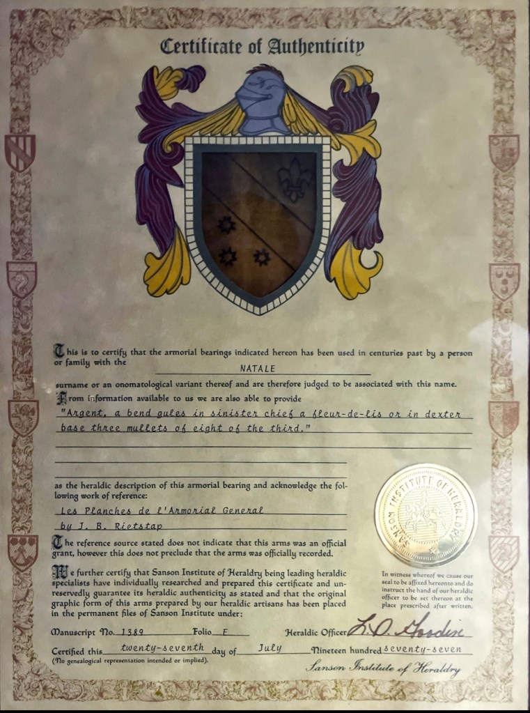 Some families bearing the Natale surname developed coasts of arms, typically featuring symbols of religious or seasonal significance, such as stars (representing Christmas), crowns, or other decorative elements linked to Italian nobility or regional identities.